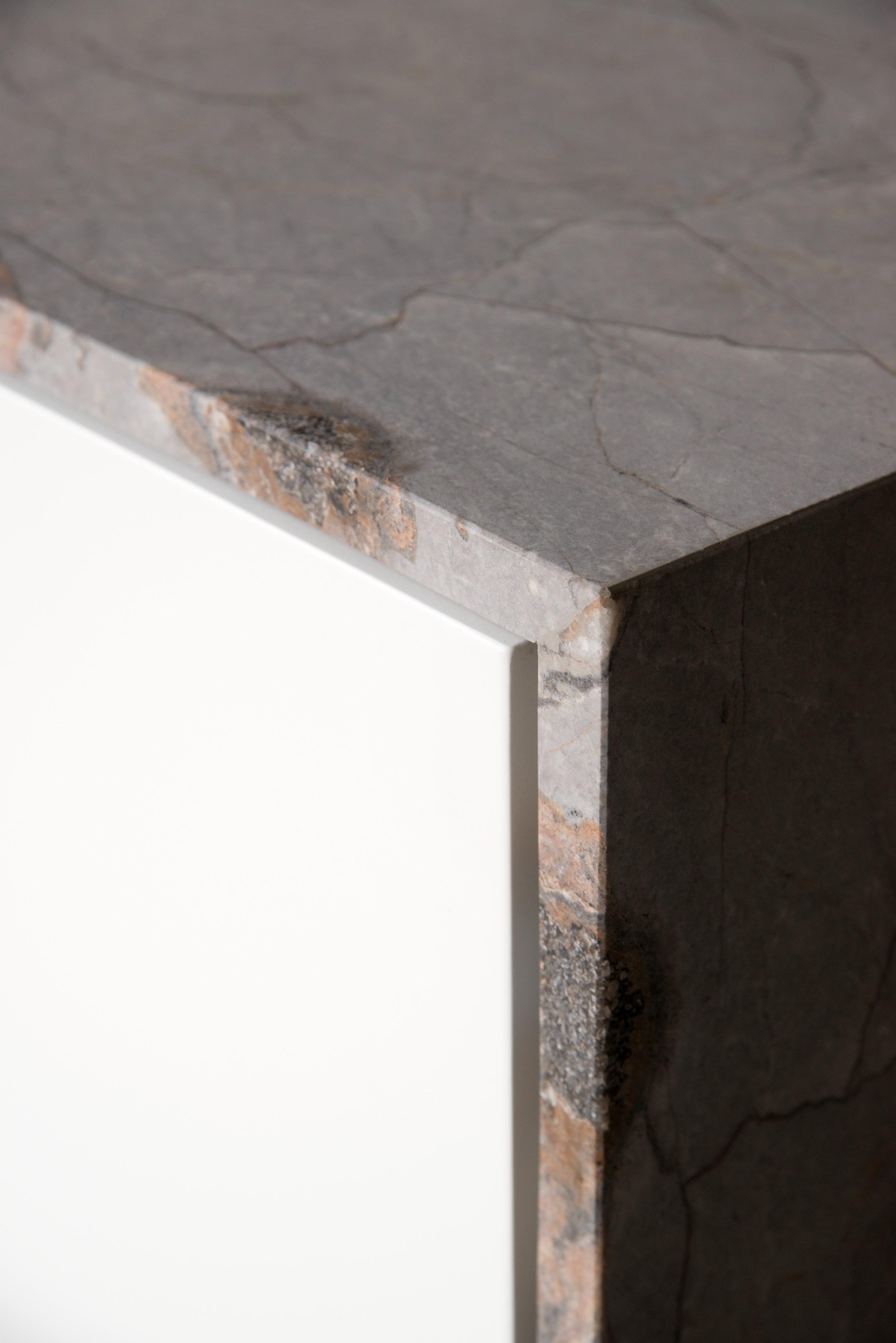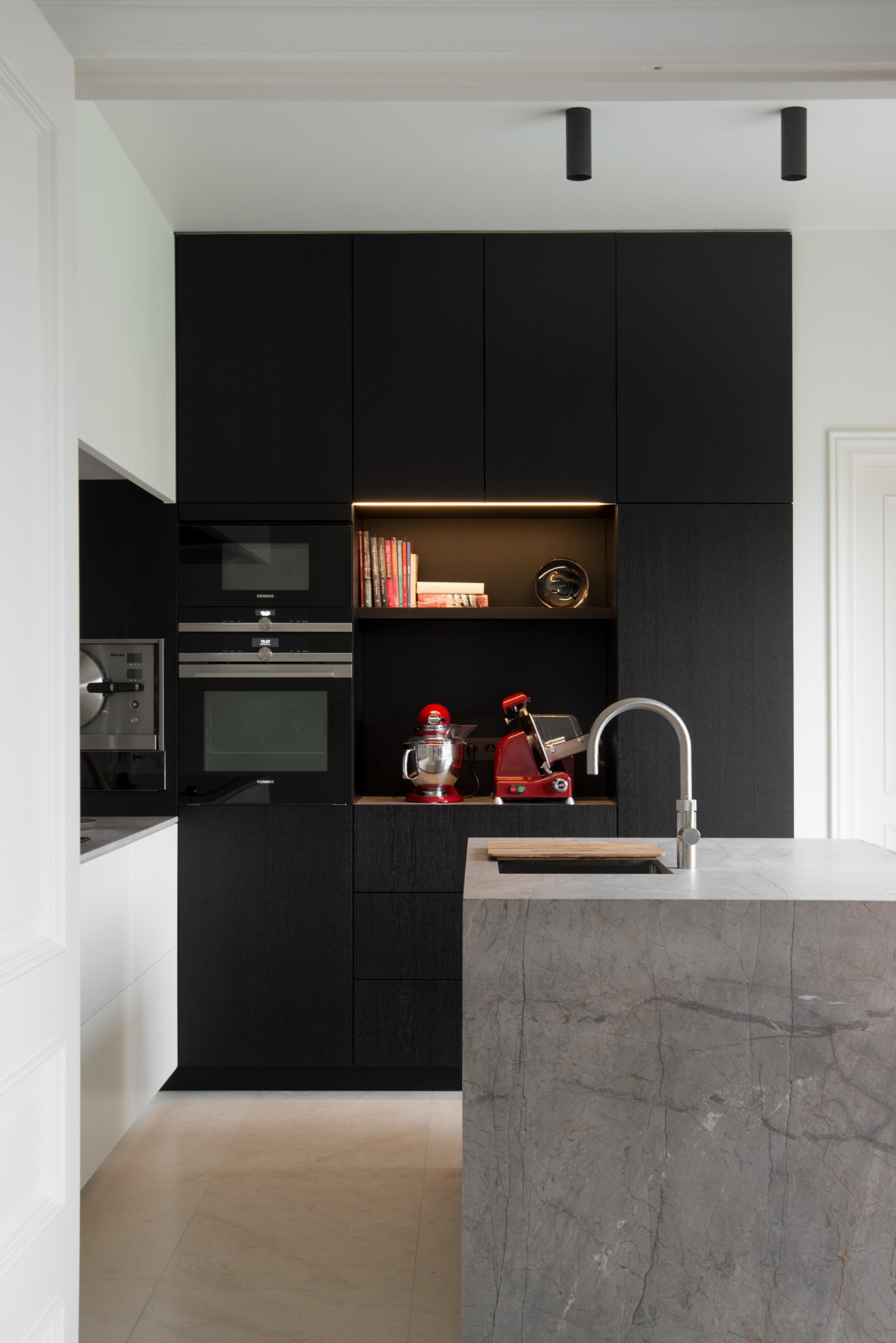 Minimalistisch, maar krachtig. De witte afwerking van deze keuken wordt versterkt door donkere accenten, wat zorgt voor een eigentijdse, gedurfde uitstraling die de ruimte definieert.