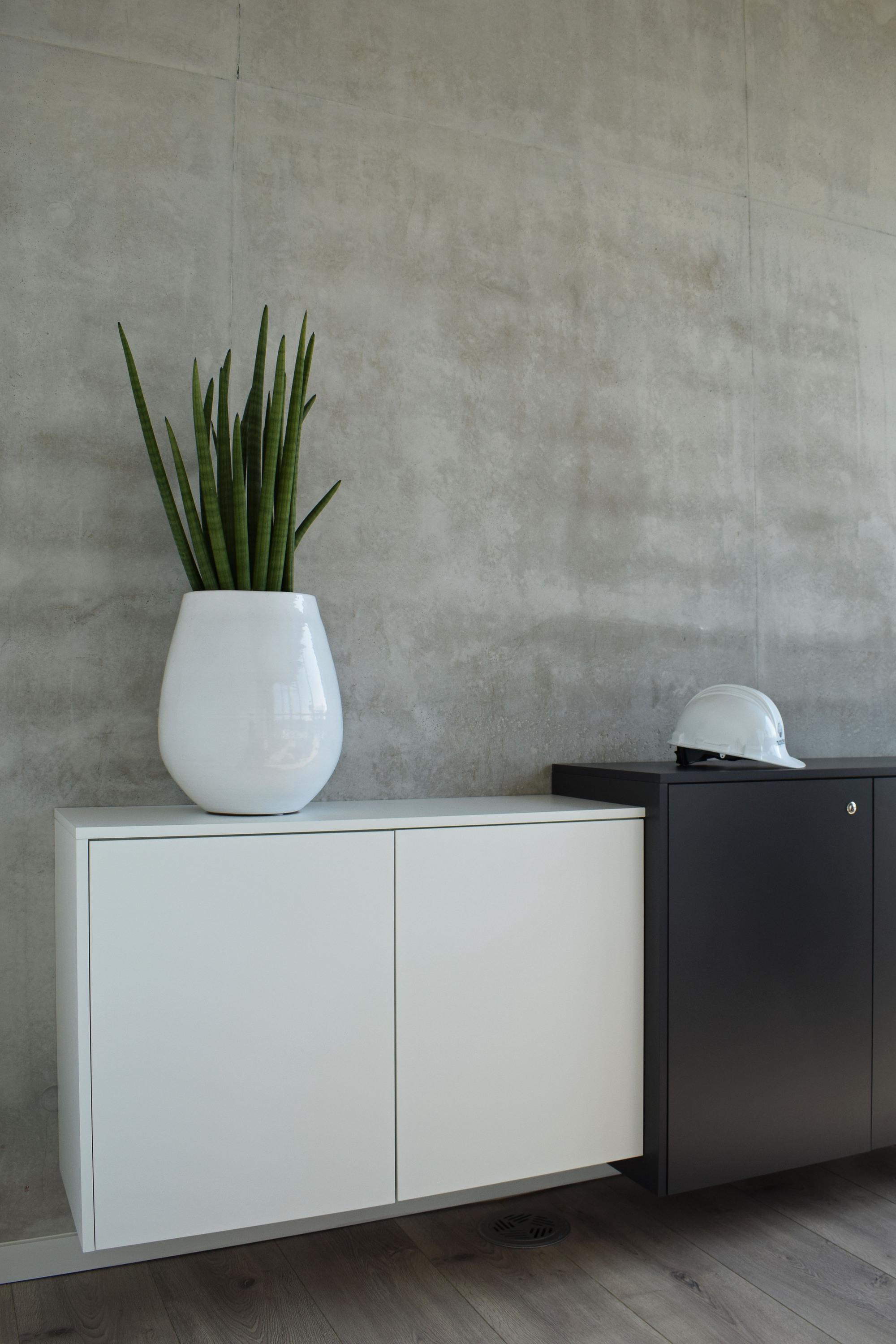 De ruimte straalt een industriële charme uit. Beton, wit en grijs bieden een minimalistische, maar krachtige uitstraling. De muren in beton vormen de basis van het ontwerp en zorgen voor een robuust karakter. Ze verwijzen subtiel naar de vloerbekisting die het bedrijf zelf toepast, wat een mooie aansluiting biedt tussen het interieur en de bedrijfsactiviteiten.