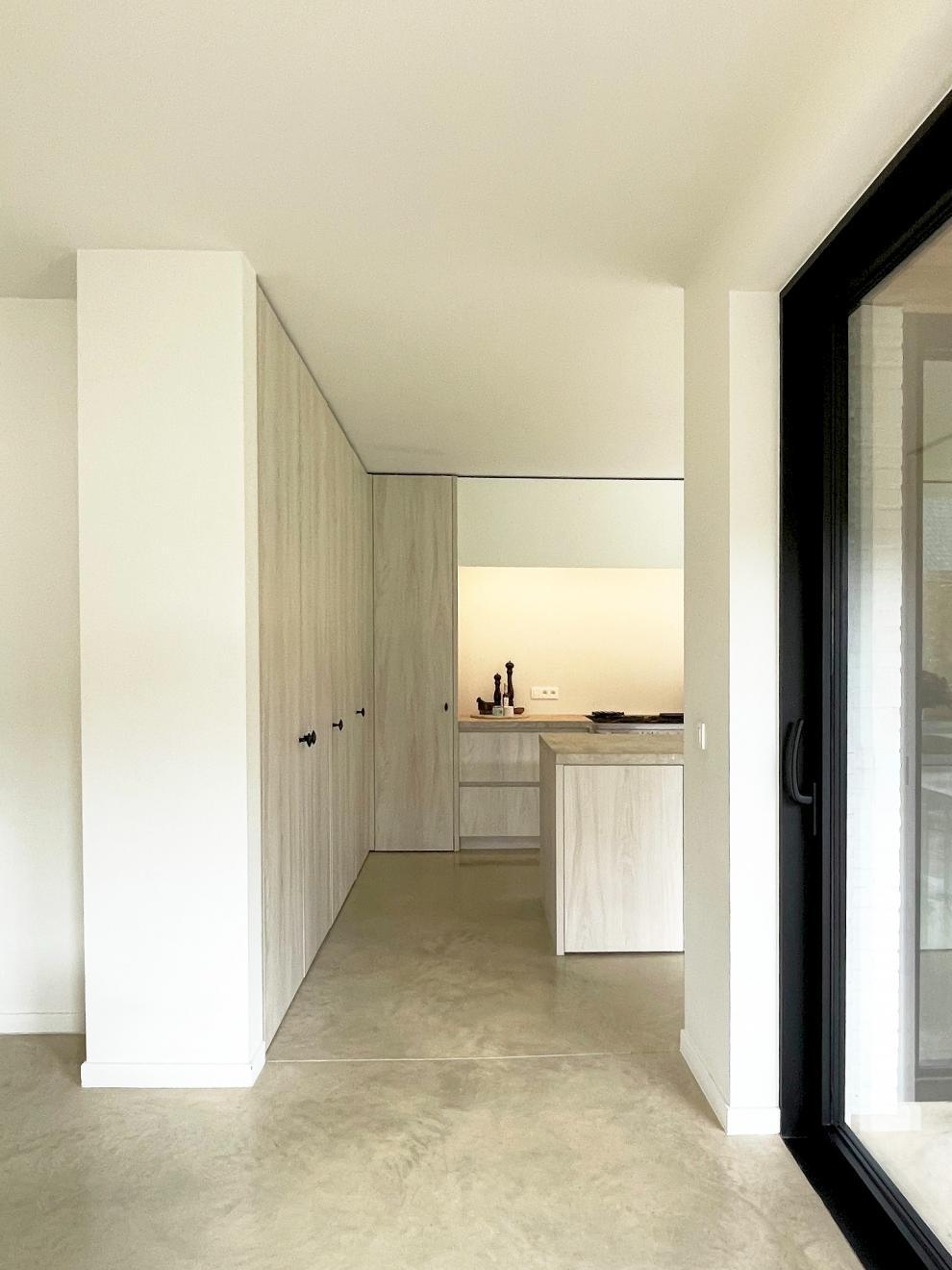 Deze keuken combineert lichte tinten met een warme houten afwerking, waardoor een moderne, uitnodigende sfeer ontstaat.